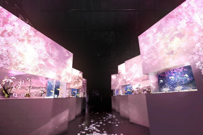 テーマは桜咲く、“春の日本庭園”。霞が漂う中、満開のソメイヨシノやしだれ桜、八重桜などのさまざまな品種が集結し、お足元には枯山水が広がる趣深い情景を22台のプロジェクターを用いて描きます。エリア内並ぶ水槽には、和の色彩が優美な鯉や金魚、メダカたちが舞い泳ぎ、ゲストはまるで絵巻物のような美しいシーンの中を散策いただけます。
