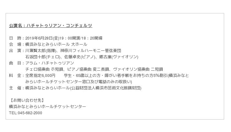 『ハチャトゥリアンが書いた協奏曲すべてが並ぶ。ちょっとないだろうと思うとニヤニヤしてしまう。ハチャトゥリアンの3つの協奏曲をいっぺんに演奏するということは、オーケストラにとって決して楽なことではないと思う。神奈川フィルがここに賭けてくれるであろうエネルギーを考えると、楽しみで仕方がない。さらに、これだけの若手ソリストがよく集結してくれたなぁと思うすばらしい顔ぶれが揃った。輝いている3人それぞれの楽器の弾きぶりを味わいながら、あふれんばかりのアイディアを持っている指揮者、川瀬賢太郎の統率力も併せて感じ取ってもらえれば楽しさ2倍どころか10倍になること間違いなし!』