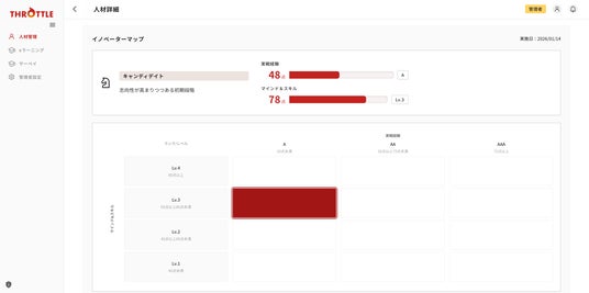 本機能の中核となるのが、Throttle上で提供される「イノベーターサーベイ」です。社員は簡易な質問に回答するだけで、志向性や資質、実務経験などを多面的にアセスメントされ、役職や過去実績だけでは見えにくかった挑戦の適性や潜在的な可能性を可視化できます。