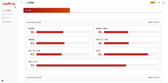 本機能の提供開始により、Throttleはこれまで提供してきた社内新規事業制度やビジネスコンテスト等のプログラム運営機能に加え、イノベーター人材の発掘・育成・活躍履歴のマネジメントまでを一気通貫で担うプラットフォームへと進化します。