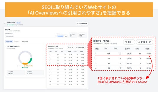 株式会社CINC(本社:東京都港区、代表取締役社長:石松友典、以下CINC)は、独自開発のAI検索最適化(GEO/LLMO)ツールに、AI Overviews(AIによる概要。以下、AIOs)の表示有無およびドメインの引用状況を分析できる機能を追加しました。