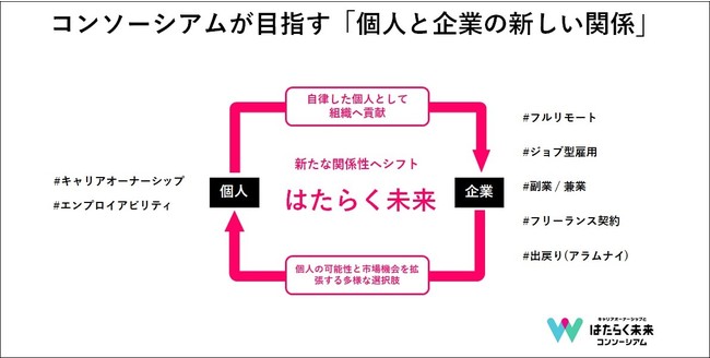 こうした状況の中で、一人ひとりの個人が、自律的に成長し続けるために不可欠なのが「キャリアオーナーシップ」。はたらく個人の力を最大化させ、社会の力にするために、企業は個人とどう向き合い、新たな関係性をつくっていくべきなのか?まだ答えのない問いに対し、先駆的に取り組む企業が自ら実践・実証し、企業と個人の持続的な成長を実現する「はたらく未来」を模索していくのが本コンソーシアムです。