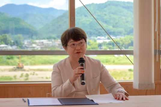 京都芸術大学は、芸術の力でより良い社会の実現に貢献する藝術立国を理念として、様々な連携プロジェクトに取り組んでいます。今回、亀岡市と連携・協力に関する協定を新たに締結することで、芸術、デザイン、アートの力で、亀岡市のさらなる発展に少しでも貢献できればと願っております。本日、オープンされ、先ほど見させていただいた亀岡市環境プロモーションセンターに関しても、環境に係る課題解決に向けた多くの取り組みがこれから始まっていくということに、強い感銘を受けました。わたしも亀岡市の三大観光のひとつである保津川下りを過去に経験しましたが、その川にそんなにプラスチックごみが流れ着くことは知りませんでしたし、市民の皆さまの力で美しい環境が維持されていることがすばらしいと思いました。これからも桂川市長をはじめ、皆さまが環境に対する様々な取り組みをされることと思いますが、京都芸術大学として、芸術やデザインの力で協力できればと考えております。