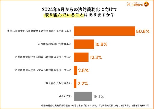 国土交通省からは不動産業務における不当な差別的取扱いや合理的配慮の提供の具体例等も公示されていますが(※3)、前項の質問と合わせると、障害者の合理的配慮の法的義務化をその内容まで理解している不動産業務従事者は少数派であることがわかり、現段階では認知・理解の浸透に課題があるといえそうです。
