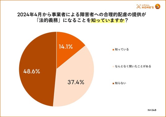 「2024年4月から事業者による障害者への合理的配慮の提供が法的義務になることを知っていますか?」という質問に対し、約半数となる48.6%が「知らない」と回答しました。次に多かった回答は「なんとなく聞いたことがある」(37.4%)で「知っている」と回答したのは14.1%に留まりました。