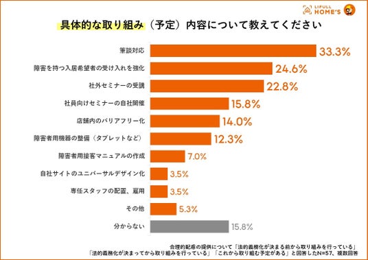 合理的配慮の提供について「取り組みを行っている/これから取り組む予定がある」と回答した人に具体的な取り組み内容について聞いたところ、最も多かった回答は「筆談対応」(33.3%)続いて「障害を持つ入居希望者の受け入れを強化」(24.6%)、「社外セミナーの受講」(22.8%)となりました。