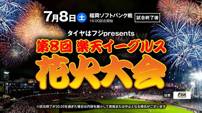 株式会社楽天野球団(本社:宮城県仙台市宮城野区、代表取締役社長:米田 陽介)は、7月8日(土)福岡ソフトバンクホークス戦の試合後に「タイヤはフジpresents 第8回楽天イーグルス花火大会」を開催することとなりましたので、お知らせいたします。