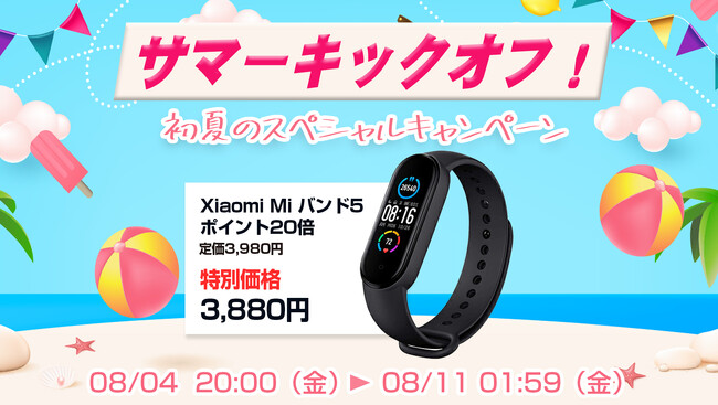楽天市場「Show !t」は8月4日(金)20時から、シャオミのMiバンド5が通常価格3,980円(税込)のところ3,880円(税込)の特別価格で販売し、さらにご購入の方にポイント20倍プレゼントを実施します。また、8月4日(金)20:00~8月11日(金)01:59まで開催される、楽天お買い物マラソンに参加し、ポイント20倍プレゼント(一部商品を除く)を実施します。この機会にシャオミのスマートバンドMiバンド5でポイントをザクザク貯めましょう。