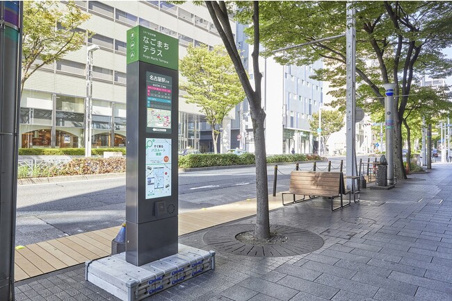 今回、2023年度のSRT社会実験として、公共交通と歩行者を中心としたウォーカブルな(歩きやすい)空間と、バス利用者が乗り降りしやすい空間の形成を目指して、広小路通のバス停を「なごまちテラス」として暫定的に整備します。本実験では、CFKが全体の企画提案と各種調査・検証を実施します。DNPは「なごまちテラス」に設置する情報機器として「DNPモビリティポート」*1を提供します。SNSと連動した新しいデジタルマップ「DNP MAPベース地域情報発信プラットフォーム」*2を活用し、沿道のイベントや近隣の施設と連動した情報を「DNPモビリティポート」で提供して、回遊性の向上と周辺の賑わいづくりを支援します。また、DNPモビリティポートに格納した「アドインテAI Beacon」*3で、スマートフォンのWi-Fi/BLE(Bluetooth Low Energy)*4接続を活用した人流回遊データを取得し、分析も予定しており、今後のまちづくりや観光振興に役立てます。