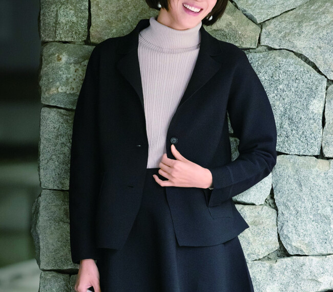 ニットジャケットを紹介します。大きめなテーラードのラペルがエレガントな印象を与えます。