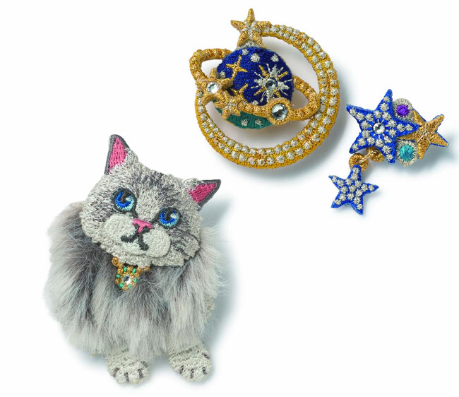今回は、猫や惑星などをモチーフにした繊細でかわいらしいブローチが登場。