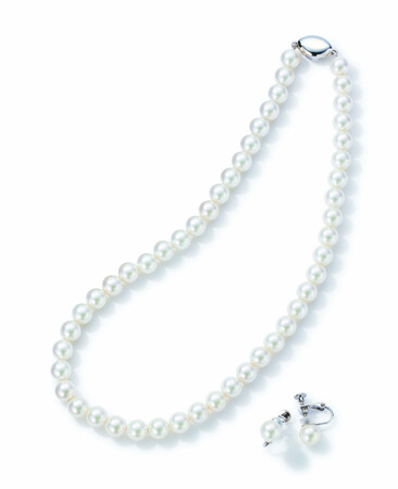 「プレミアムパール」は、アコヤパールの輝きを目指して作り出した貝パールをあしらったジュエリーを提案するブランドです。養殖アコヤパールに使う貝核と同じ貝核を用いることで、まるで本物のような色調や光沢に仕上げています。今回は、大阪・泉州の工房の職人が手作業で作製したネックレスとピアスが登場。存在感のある