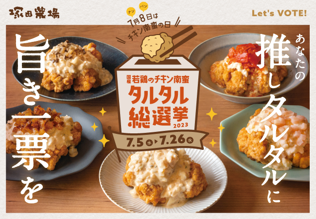 株式会社エー・ピーホールディングス(本社:東京都豊島区、代表取締役 社長執行役員CEO:野本周作)が運営する塚田農場は、宮崎県延岡市が発祥とされる「チキン南蛮」の魅力を伝えるため7月8日をナン・バンと読んで制定した「チキン南蛮の日」に合わせた7月5日㊌~7月26日㊌の期間中、「タルタル総選挙2023」を実施し、5種類のタルタルソースの国産若鶏のチキン南蛮を提供いたします。