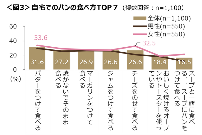 自宅でパンを食べる時は、「バターをつける」で3割と一番多い。<図3>
