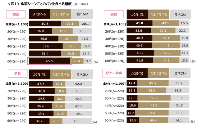 食事シーンごとのパンを食べる頻度を聞いたところ、「朝食」で「よく食べる」人は半数となった。<図1>