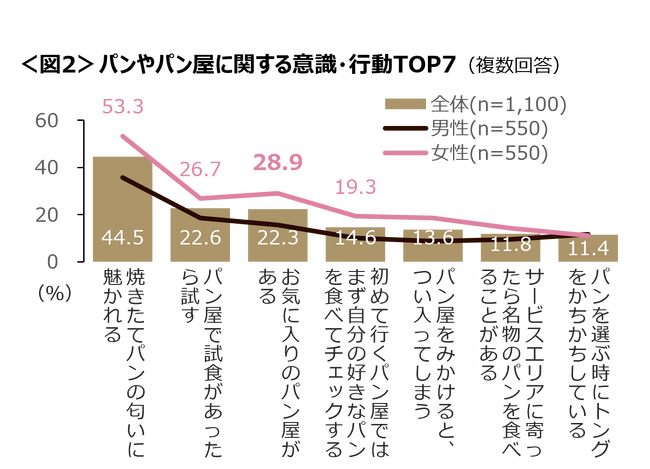 女性は男性と比べて「焼きたてパンのに匂いに魅かれる」「お気に入りのパン屋がある」「パン屋で食があったら試す」などの”パン屋”に関する項目が高い。