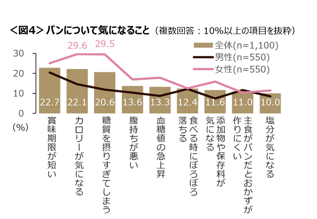 パンについて気になることは、「賞味期限が短い」「カロリーが気になる」「糖質を摂りすぎてしまう」で2割台。<図4>