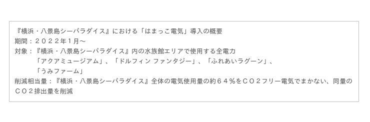 当社では、2022年1月より、東京電力エナジーパートナー株式会社(本社:東京都中央区、代表取締役社長:秋本 展秀)が横浜市内の事業者に提供する、横浜市内において創出した環境価値を活用した実質CO2排出ゼロの電力「はまっこ電気」を導入し、『横浜・八景島シーパラダイス』で使用する水族館内の電力使用によるCO2排出量が実質的にゼロとなる取り組みをいたします。これは、横浜市が推進する「Zero Carbon Yokohama(2050年までの脱炭素化)」の主要施策の一つ、再生可能エネルギーの地産地消を、水族館事業者としてその趣旨に賛同し、当社のサステナビリティアクションの一つとして取り組むものです。
