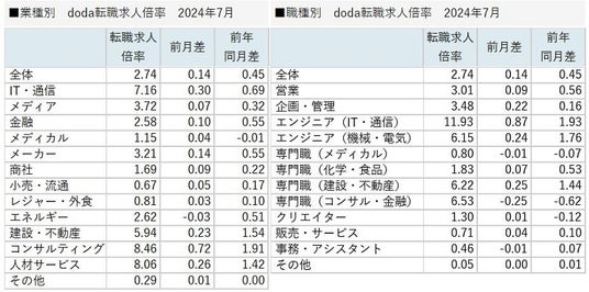 パーソルキャリア株式会社が運営する転職サービス「doda(デューダ)」(編集長:桜井 貴史)は、2024年7月の転職求人倍率をまとめた「doda転職求人倍率」を発表いたします。