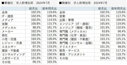 求人数は、業種別では12業種(「その他」は除外)のうち10業種で前月から増加しました。最も増加率が大きかったのは「コンサルティング」(前月比112.2%)、次いで「小売・流通」(前月比104.5%)でした。職種別では11職種(「その他」は除外)のうち8職種で前月から増加しました。最も増加率が大きかったのは「エンジニア(IT・通信)」(前月比105.6%)、次いで「専門職(建設・不動産)」「企画・管理」(前月比103.1%)でした。