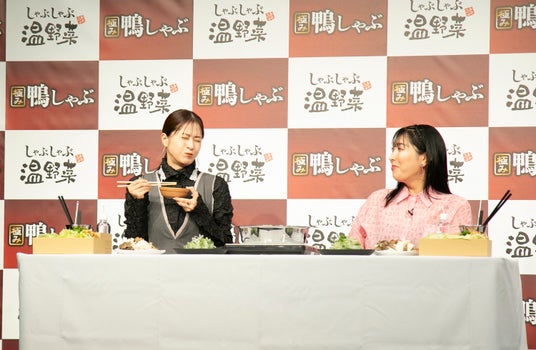 松本さんは「(グッドサインをだしながら)美味しい!鴨肉の甘みとシャキシャキのねぎが鴨肉ととても合っていて最高です!」とコメントしました。3時のヒロインの福田さんは「鴨が柔らかくて、極み白舞茸もシャキッとしていて、食感も美味しかった。短時間でのしゃぶしゃぶだと柔らかい鴨肉を感じられ、眺めにしゃぶしゃぶすると噛み応えも出てきて、噛むたびに鴨の風味が口に広がります。」とコメントしました。