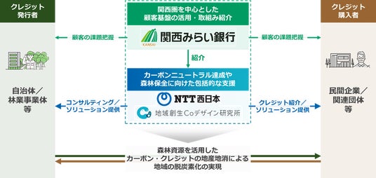 これらの状況を踏まえて、西日本エリアを中心に地域創生活動に注力しているNTT西日本および全国の持続的な森林管理の支援やJ-クレジットに係る支援を進める地域創生Coデザイン研究所、関西圏を中心に多様な顧客基盤を保有する関西みらい銀行が連携し、カーボン・クレジットを「関西で生み出し、関西で利用する」地産地消型の地域脱炭素化実現をめざします。