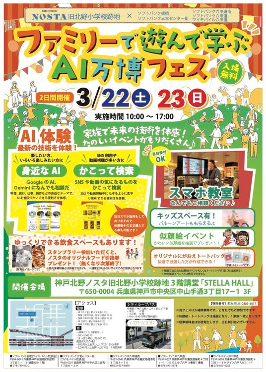 GLION GROUP(ジーライオングループ 所在地:兵庫県神戸市)と株式会社アクアイグニス(所在地:東京都)が運営する株式会社神戸北野スイーツ&カフェは、旧北野小学校をリノベーションしたグルメ複合施設「神戸北野ノスタ」にて、株式会社ソフトバンク(所在地:東京都)とコラボした期間限定イベント「ファミリーで遊んで学ぶAI万博フェス」を2025年3月22日(土)、23日(日)に開催いたします。