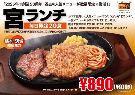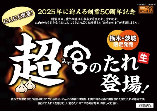 コロワイドグループの株式会社アトム(本社:神奈川県横浜市、代表取締役社長:小島保幸)は、栃木県・茨城県の「ステーキ宮」26店舗限定で、2024年5月24日(金)より、「超宮のたれ」&「復活!宮ランチ」を実施いたします。
