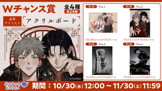 さらに、Wチャンス賞を実施!くじ1枚ごとに抽選で「直筆サイン入りアクリルボード(全4種)」をプレゼント!くじ購入者全員が参加可能です。