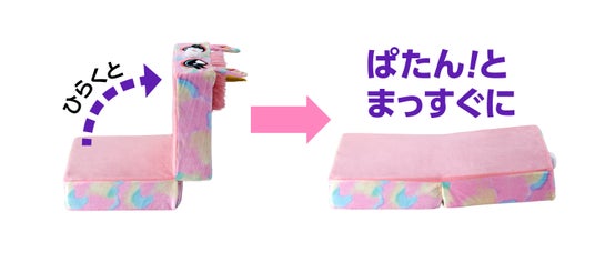 ぬいぐるみとして遊べるだけでなく、眠くなったら口をパタンと開くだけで、まっすぐなフルサイズまくらに早変わり。お子さまのそばにずっと寄り添う素敵な友だちとしてお迎えください。