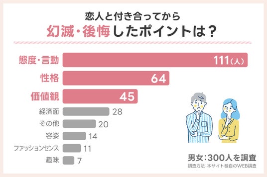 男女300名に対して「恋人と付き合ってから幻滅・後悔したポイントは何ですか?」と聞いたところ下記の結果となりました。