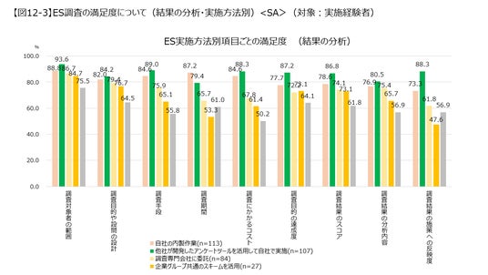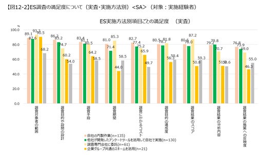 またES調査の実施方法別に各工程における満足度を分析したところ、「設計」「結果の分析」を、実施率の高まった「他社が開発したアンケートツールを活用して自社で実施」した場合、調査全体の満足度が高くなる傾向がみられた。ただし、「実査」の実施については、他の実施方法に比べ特に満足度が高いとはいえない結果となった。(図12-1, 図12-2, 図12-3)