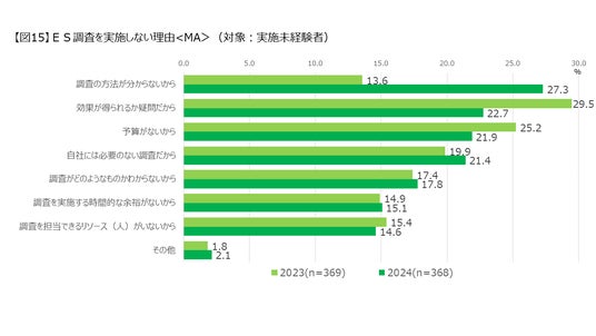 ES調査・非経験者が回答した実施しない理由のトップは、27.3%で「調査の方法が分からないから」だった。「効果が得られるか疑問だから」(22.7%)、「予算がないから」(21.9%)、「自社には必要のない調査だから」(21.4%)と続く。