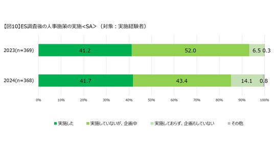 調査の結果を反映した人事施策の実施については「実施」と回答したのは全体の41.7%となり、前回調査とほぼ同様。一方、「実施していないが企画中」が減少し、「実施しておらず、企画もしていない」が7.6pt増加した。【図10】
