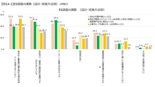 これをES調査の実施方法別にみると「設計」を「自社の内製作業」で行った場合は「有効な人事施策の優先順位の検討材料として活用できていない」(52.9%)、「自社内で、調査や設問設計の専門スキルが不足している」(51.1%)が課題の上位。「他社が開発したアンケートツールを活用して自社で実施」した場合は「アンケート結果の分析が不十分」(50.5%)、「自社内で、調査や設問設計の専門スキルが不足している」(47.8%)が課題の上位。共通して「自社内で、調査や設問設計の専門スキルが不足している」ことは課題。「結果の分析」の実施別でみても課題の上位傾向は同様。(図14-1, 図14-2)