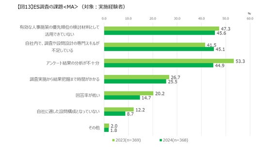 ES調査における課題は「有効な人事施策の優先順位の検討材料として活用できていない」(45.6%)がトップとなった。次いで「自社内で、調査や設問設計の専門スキルが不足している」(45.1%)、「アンケート結果の分析が不十分」(44.9%)。前回調査では、「アンケート結果の分析が不十分」が最も多かったが、今回の調査では、8.4pt下がった。