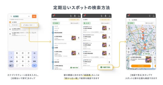 今回の対応により、通勤や通学時にアクセスしやすい店舗に立ち寄ったり、休日に交通費をかけずに人気なお出かけスポットを見つけられるようになり、目的地の検討にお役立ていただければと思います。仕事帰りに停車駅の中で最も駅から近いお気に入りのチェーン店を探したり、休日は定期券を利用して人気スポットに行ってみるなど、その時々で最適な場所を選択するための一助としてご活用いただけます。