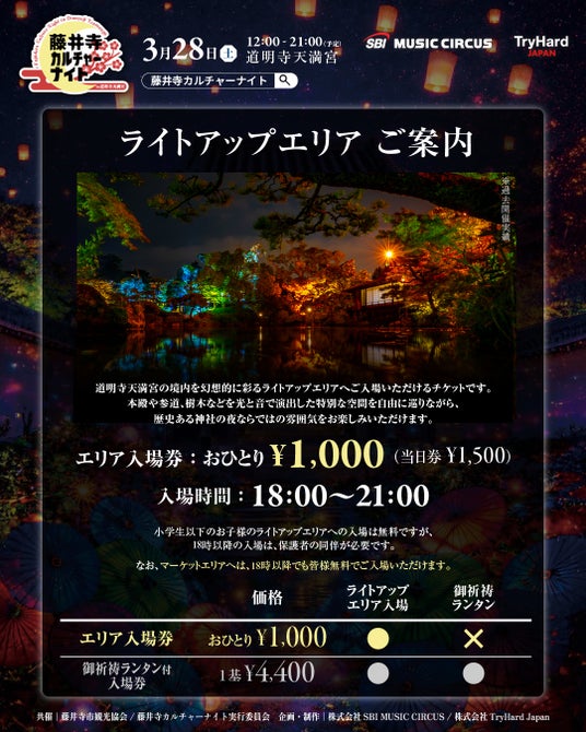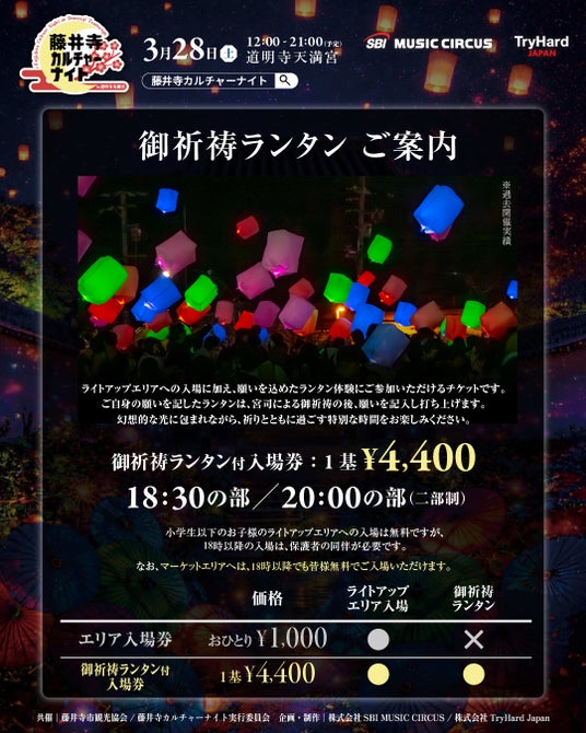 藤井寺市観光協会および藤井寺カルチャーナイト実行委員会は、2026年3月28日(土)に大阪府藤井寺市・道明寺天満宮にて開催される「藤井寺カルチャーナイト in 道明寺天満宮」の入場前売りチケットの販売を開始いたします。