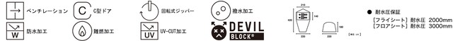 性能 : 難燃加工、耐水圧2000mm/フロア3000mm、撥水加工、UV-CUT