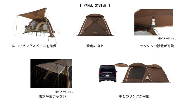 LOGOS独自の「PANEL SYSTEM」により、テントの全面がキャノピー2本で簡単に自立するタープとなり、より充実したリビングスペースを確。パネルルーフの筋交いかつ湾曲した構造により、フルクローズ時の強度に優れるほか、オープン時に雨水が溜まる心配なし。また、ランタンの吊り下げ可能で、車とのリンクも簡単。