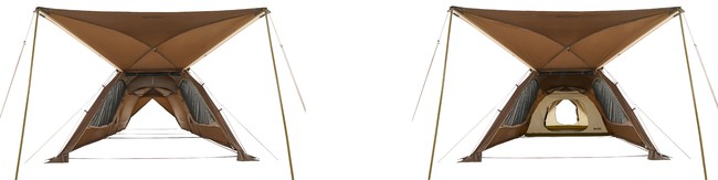 着脱簡単なインナーテントせば、フライシート単体でもスクリーンタープとして使用可能。