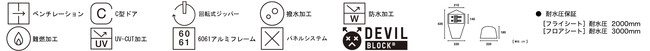 性能 : 難燃加工、耐水圧2000mm/フロア3000mm 撥水加工、UV-CUT