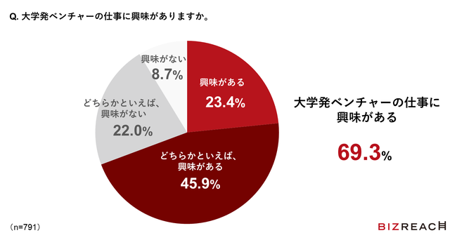 「ビズリーチ」の会員を対象に実施した調査※4で、大学発ベンチャーに興味があると回答した人は69.3%にのぼりました。また勤務形態については、「副業・兼業」を希望するビジネスパーソンが最も多く(45.8%)、その理由として「転職せずに、新しい挑戦ができるため(67.7%)」「今後のキャリアにおける、選択肢としての可能性を探るため(61.0%)」があがりました。コロナ禍以降、主体的なキャリア形成の意識が高まるなか、キャリアにおける新たな選択肢の一つとして、大学発ベンチャーに興味を持つビジネスパーソンが多いことが分かります。