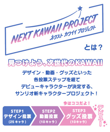 NEXT KAWAII PROJECTとは、サンリオの新たなKAWAIIの原石をみなさんと一緒に見つける新キャラクタープロジェクトです。「STEP1:デザイン投票」、「STEP2:動画投票」、「STEP3:グッズ投票」の3つの応援ステップを通して、デビューするキャラクターが決定します。みなさんが推したくなるキャラクターはいましたか?次世代のKAWAIIを、一緒に応援しましょう。