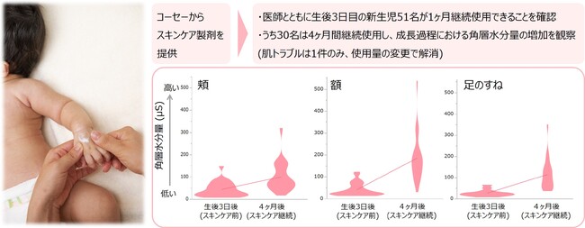 株式会社コーセー(本社:東京都中央区、代表取締役社長:小林 一俊)は、小児アレルギーの専門医療チーム(千葉愛友会記念病院、千葉県流山市)と共同で実施している「妊婦への教育介入による赤ちゃんのアレルギー発症予防に関する研究」において、当社が研究資材として提供した乳液型のスキンケア製剤が生後3日以降の新生児(生後28日までの赤ちゃん)にも安全に使用できることを確認しました。また、一般的に乾燥しがちである赤ちゃんの肌に対し、4ヶ月間の継続使用により肌の水分量が増加することが確認できました。