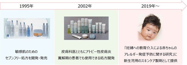 本試験で提供したスキンケア製剤は、25年以上になる当社の敏感肌に向けた研究が応用されています。1995年に発売された敏感肌向けのセブンフリー処方(刺激になりうる7つの成分種をできる限り低減した処方)を実現した製剤・保証研究をはじめ、2002年には皮膚科医と連携してアトピー性皮膚炎の寛解期(一時的に症状がおさまっている状態)の患者でも使用できることを確かめたスキンケア処方を開発しました(図3)。このような研究知見を応用したのが今回のスキンケア製剤であり、生まれたばかりの新生児の肌でも安全に使用できることを確認することができました。