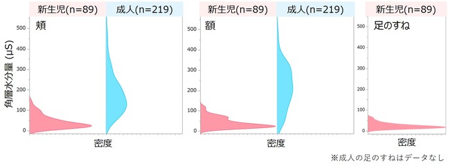 新生児の肌は、水分量が少なく乾燥しやすいことが知られています。今回、実際に生後3日目の新生児の肌の水分量を当社が保有する成人のデータ(20~60代の219名、平均年齢37.5才、男女比1:2)と比較してみると、新生児の肌の水分量は成人の約3~4分の1程度であることが分かりました(図2)。