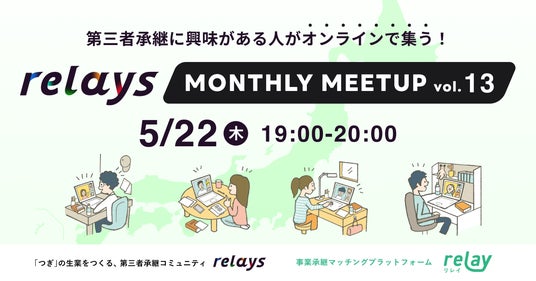 オープンネーム事業承継「relay(リレイ)」を運営する株式会社ライトライト(宮崎県宮崎市 / 代表取締役:齋藤隆太)は、第三者承継コミュニティ「relays(リレイズ)」にて、事業承継について気軽に話せ、交流できるオンラインイベント「relays MONTHLY MEETUP vol.13」を開催いたします。5月22日(木)19時~開催、第三者承継コミュニティ「relays(リレイズ)」会員は参加費無料です。