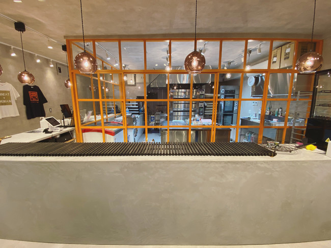 【小麦の奴隷】スピリットがここに集結。高級感のあるガラス張りの厨房は、全国から集まる店長の研修施設でもあり、2階にはイートインやイベントスペースも