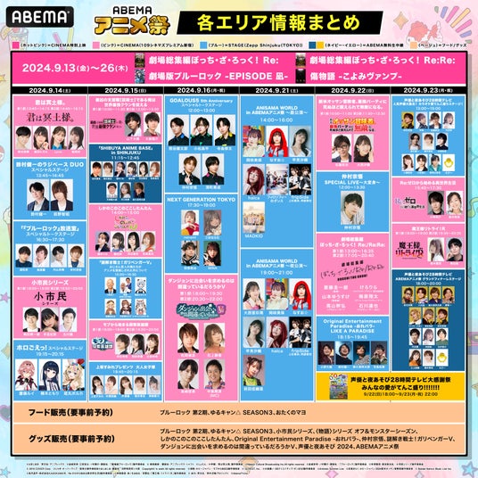 新しい未来のテレビ「ABEMA」は、2024年9月のシルバーウィークに最大級のアニメの祭典「ABEMAアニメ祭(まつり)」を開催中です。本イベントでは、“もっとアニメを好きになる”をコンセプトに、人気アニメ作品のシネマ上映をはじめ、オリジナルフードやグッズ販売、さらに「ABEMA」のオリジナル番組や、豪華声優・ゲスト陣が出演する全13ステージ、全28作品・91組が参加するスペシャルイベントをお届けいたします。